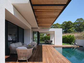 Given the hot Mediterranean climate, the exterior is clad in white, reflecting light and heat. The upper-level terrace is equipped with foldable shutters to regulate solar exposure, while a canopy shades the outdoor terrace, ensuring year-round comfort. The surrounding boundary wall, required for security, has been designed with sensitivity: while solid at its base, it transitions into a semi-transparent structure at higher levels, maintaining visual connection with the landscape and greenery beyond.