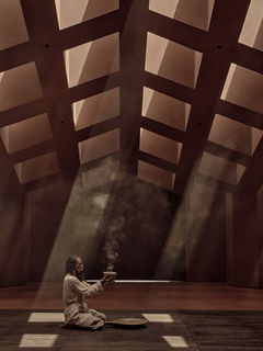 In the underground spaces, skylights pierce the mass, directing shafts of natural light into the meditation rooms below. This deliberate interplay between light and darkness emphasizes the transformative journey from shadow to illumination. Narrow corridors and courtyards channel light into the spaces, creating a layered and atmospheric environment that fosters introspection.